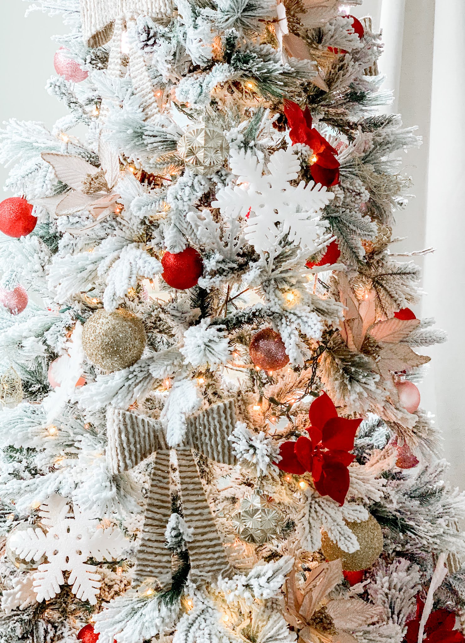 When it became time to decorate my Christmas tree this year I decided to go a little more on the feminine side. In previous years, I’ve always gone with the more traditional reds and greens. Last year I ended up flocking our Christmas tree because I love the look of snow on the branches. This year, however, after I had re-flocked the tree and made a huge mess we ended up bending one of the legs which made the tree lean. I took that as a sign/excuse to buy a whole new tree. I know my husband could have fixed the leg but I knew I didn't want to keep re-flocking the tree each year either. I ran out to Walmart and found this gorgeous pre-flocked Christmas tree. The branches are flocked really thick and they also have pinecones throughout it! I think when I got this tree that is when I knew I needed new ornaments. I tend to have a more masculine styled home so for the tree I wanted to go for the extreme opposite. I was in Hobby Lobby (which my husband has now banned me from haha) just staring at the beautiful pinks, golds and bows and flowers and just everything girly. So I did it...and this is how it turned out. What do y'all think!?!